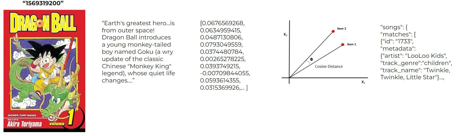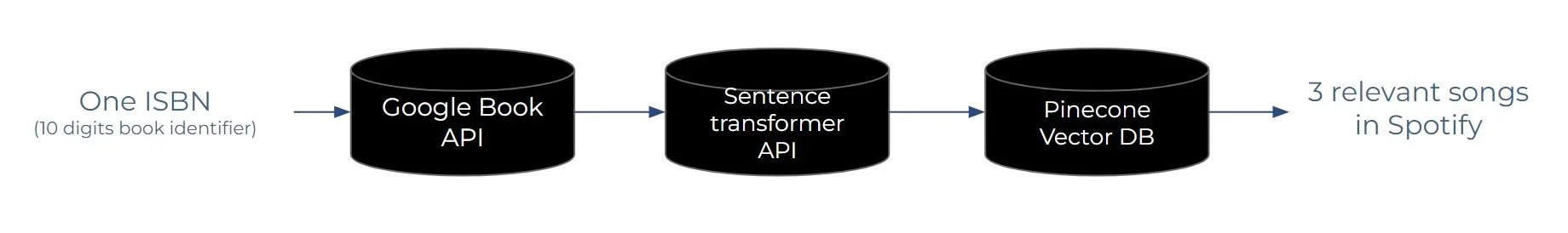 1. Input 2. Get book description 3. Get a word embedding 4. Find similar vectors in DB 5. Output